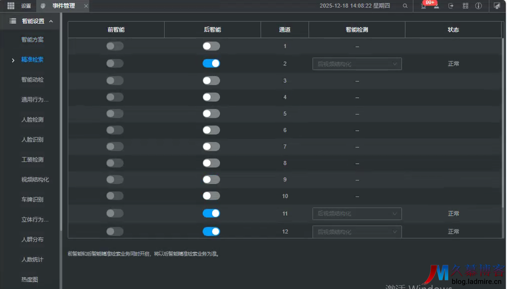 功能校验: 重启后,进入“智能分析”配置界面,确认是否出现“后智能配置”及 3 路精准检索的通道选项。