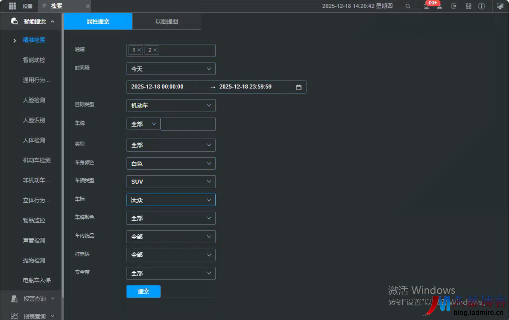 传统的录像检索需要人工逐秒回放,极其耗时。精准检索(摘要)功能 通过对已存储的普通视频录像进行二次 AI 建模,提取出其中的人、车、非机动车目标及其属性(如衣服颜色、是否戴帽子、车牌号码等)。