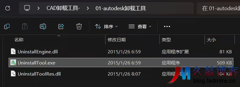 在你的 Autodesk 安装包文件夹(或专门下载的卸载工具包)中,找到 UninstallTool.exe。这个文件通常伴随着 UninstallEngine.dll 等动态链接库文件。