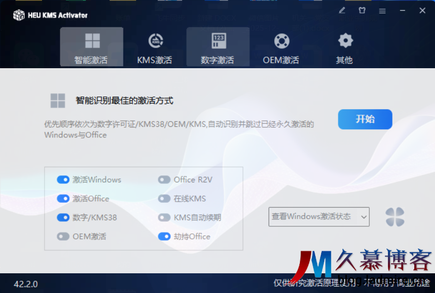这是最适合小白用户的模式。点击“开始”按钮后,程序会按照数字许可证 > KMS38 > OEM > KMS 的优先顺序自动识别并跳过已经永久激活的产品。它能够自动识别最佳激活方式,真正实现一键无忧。