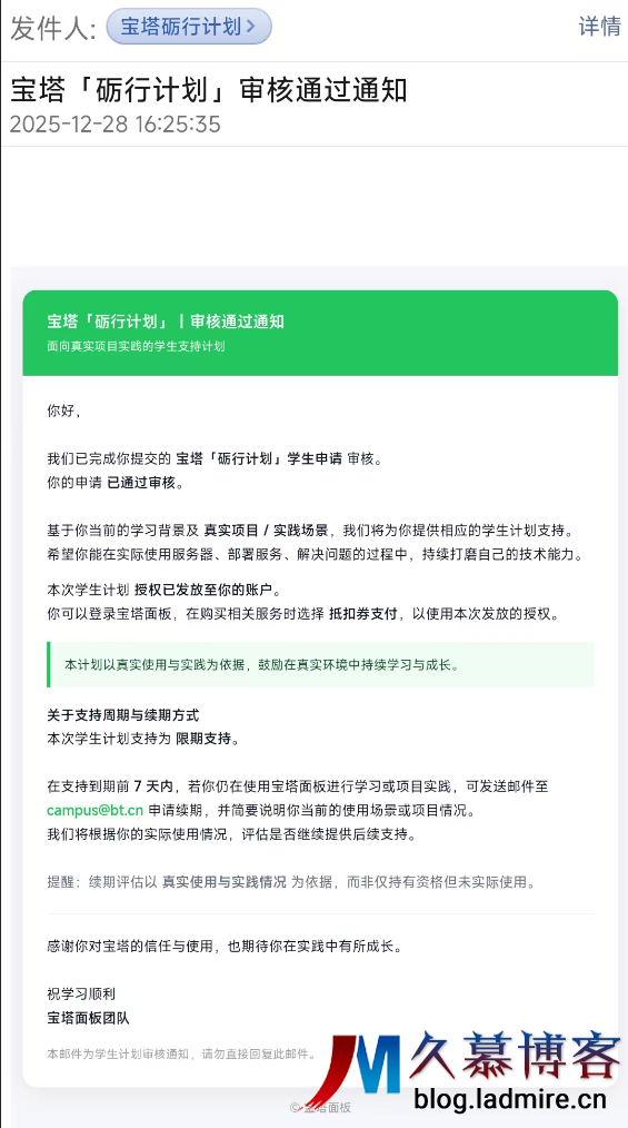 审核结果公示:就在刚才,我收到了来自 campus@bt.cn 的邮件通知。内容显示:“你的申请已通过审核,本次学生计划授权已发放至你的账户。” 登录面板一看,果然已经可以抵扣支付了,当日申请当日过!