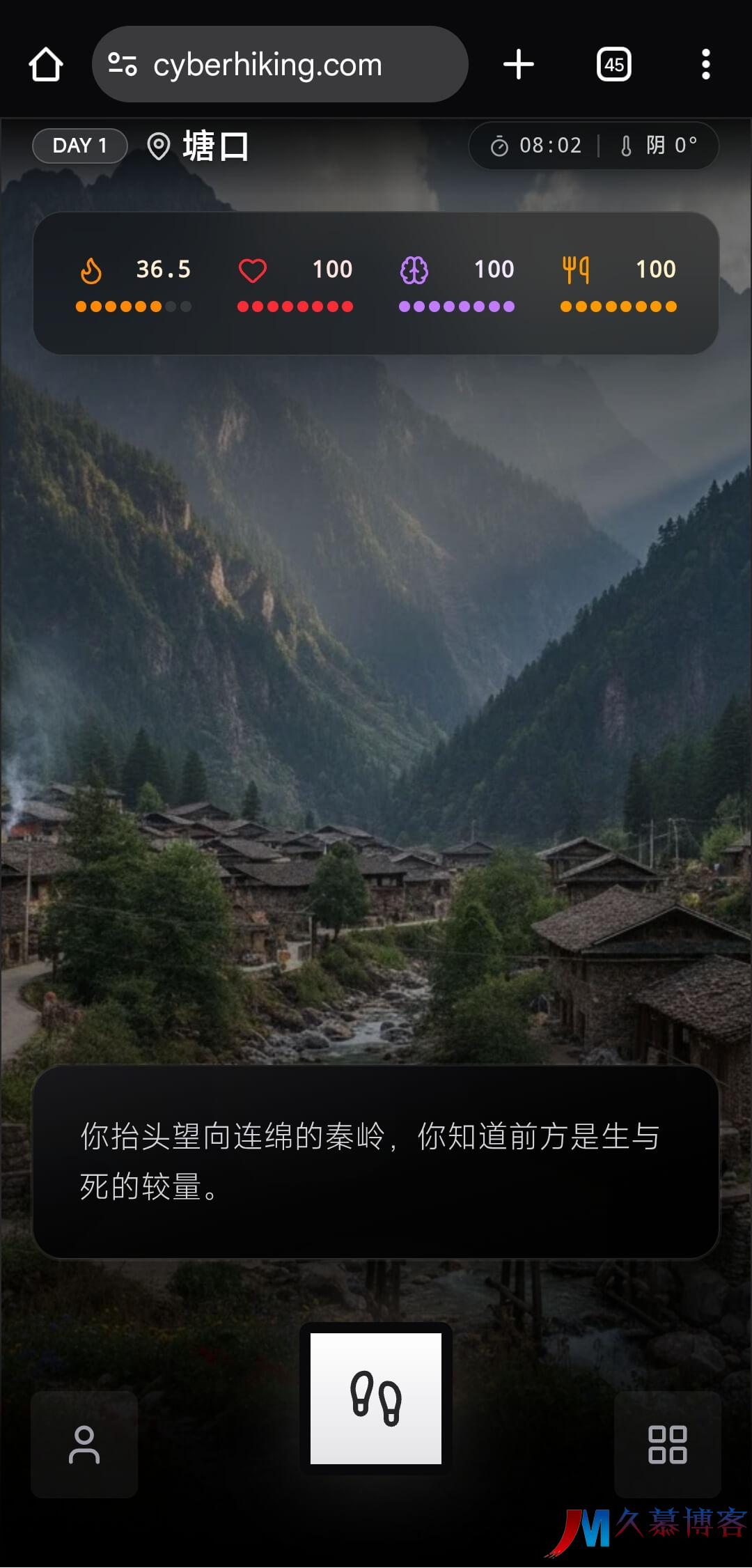 在 cyberhiking.com 中,玩家将从经典的入口塘口村出发,踏上那条被称为“尸体是唯一路标”的鳌太线。游戏界面简洁却透着肃杀之气,你需要平衡体温、水分、精神状态和饱腹感。