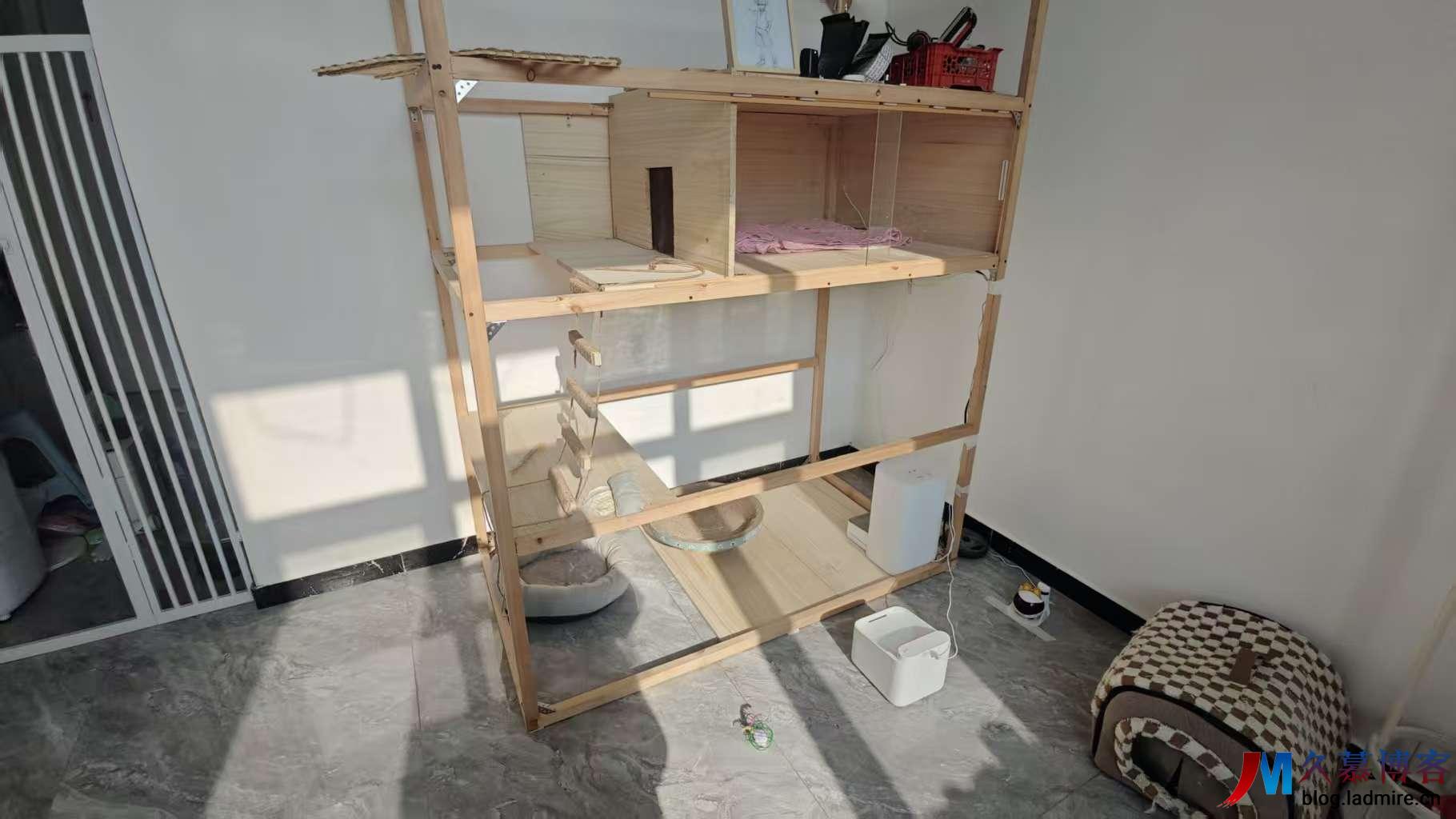 因为我家里专门腾出了一个房间作为独立猫屋,所以在这个“房中房”的设计上,我摒弃了传统猫笼那种压抑的全封闭感。除了顶层保留了一个用于避风保暖的密封式猫窝外,其余层级全部采用开放式结构。