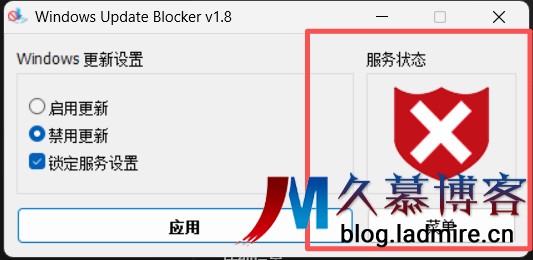 稍等几秒钟,当你看到右侧的盾牌图标由绿色变成 红色且带有“X”号 时,说明屏蔽已经成功。此时,你的 Windows 更新服务已经被完全锁定,再也不会在后台偷偷下载补丁了。