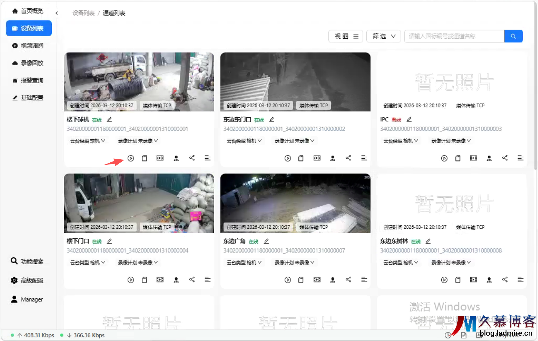 点击设备进入通道列表,即可查看该录像机下挂载的所有摄像头通道,并进行实时视频预览。